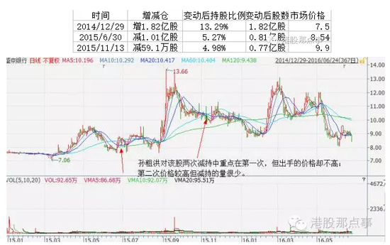 盛京银行(2066.HK)2014年年报显示,孙粗洪持有该股13.29%(1.82亿股),而盛京银行上市日期为2014年12月29日,这说明孙粗洪持有盛京银行的股份价格一定是低于或等于7.56元(上市发行价)的。2015年6月30日和11月13日,孙粗洪分别减持了10160万股59.1万股,套现额度大概为8.6亿港元。目前最新持股比例为4.98%(0.77亿股),盛京银行最新价格为8.42港元,据此估算,孙粗洪在该股上暂时的盈利为最低1.4亿港元。