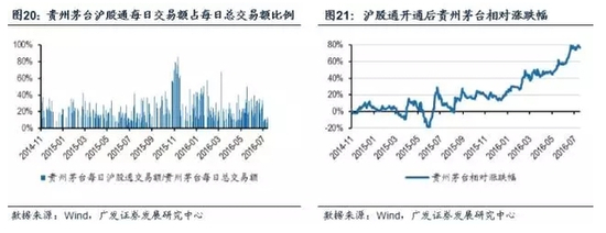 截止2016年8月1日,沪港通开展双向交易共398天,其中有313天贵州 茅台位列前十大活跃股,活跃天数占比近80%。从交易额角度来看,沪股通每日交易额占贵州茅台每日总交易额的比例平均值为17%,最高值则高达86%。上 文我们提到过,全部标的股票的沪股通交易额占标的股票总交易额的比例还不到2%,从整体上来说,沪股通交易额影响很小,但单就贵州茅台个股来说,沪股通起 码在交易额方面对贵州茅台有相当程度的影响。