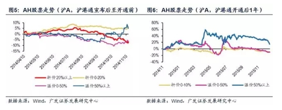 如果把时间进一步拉长至沪港通正式开通前,折价股票与溢价股票的表现出现了反转,临近沪港通开通前两个月,高溢价的A股组合反而成为表现最好的一类股票,而高折价A股组合反而成为表现最差的一组。沪港通正式开通后,无论是在牛市时期还是股灾时期,折价A股组合的走势都不如溢价A股组合。事实上,高溢价的A股组合反而是走势最好的一组。