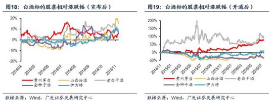 白酒板块在沪港通宣布后整体表现不错,而在市场上推荐较多的这些白酒标的股票 中,老白干酒和贵州茅台是其中表现最好的。沪港通正式开通后,老白干酒恰进行混改,因而股价远超行业平均水平,与沪港通关系不大;贵州茅台沪港通开通后一 年内基本与行业平均水平较为接近,直至2016年股价才开始大幅超越行业平均水平。