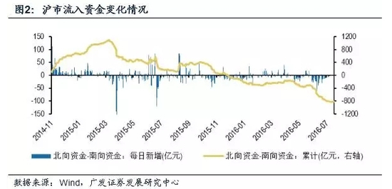 沪港通开通后,资金双向流动。沪港通下资金净流方向经历了一个由北上资金多于 南向资金到南向资金多于北向资金的的过程。受益于2015年上半年A股牛市,北向资金流入大于南向资金的分流,整体表现出沪港通下沪市资金净流入的态势。 但2015年4月份香港股市火爆,吸引不少内地资金南下,沪港通下资金流动趋势开始反转,而2015年中股灾后,沪港通下沪市资金被进一步分流,到 2015年底,沪港通下北向资金由累计净流入变为累计净流出状态。截至2016年8月1日,沪港通下沪市资金累计流出800亿元。