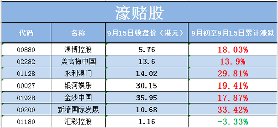 智通财经还统计了9月以来截止9月15日,濠赌股板块相关个股的累计涨跌情况: