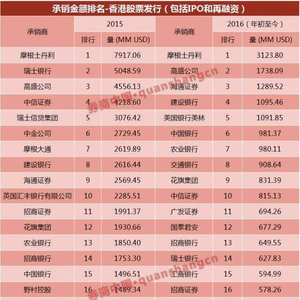 单就IPO来说,中资投行的实力是最强的,已经超过外资投行。2015年香港IPO发行量排名第一的是摩根士丹利,第二的是高盛。而今年年初至今,IPO承销金额排名前五席已经完全被中资投行占领,依次分别是:海通、建行、中行、招行、交行,第六名才是高盛,而摩根士丹利下滑排第七。