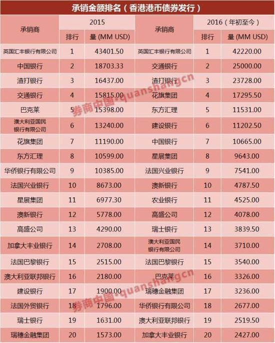 而债券方面,2015年香港港币债券发行量前十名中只有中国银行、交通银行,今年建设银行也挤进前十,交行排名也上升到第二名,排名第一的仍是汇丰银行。