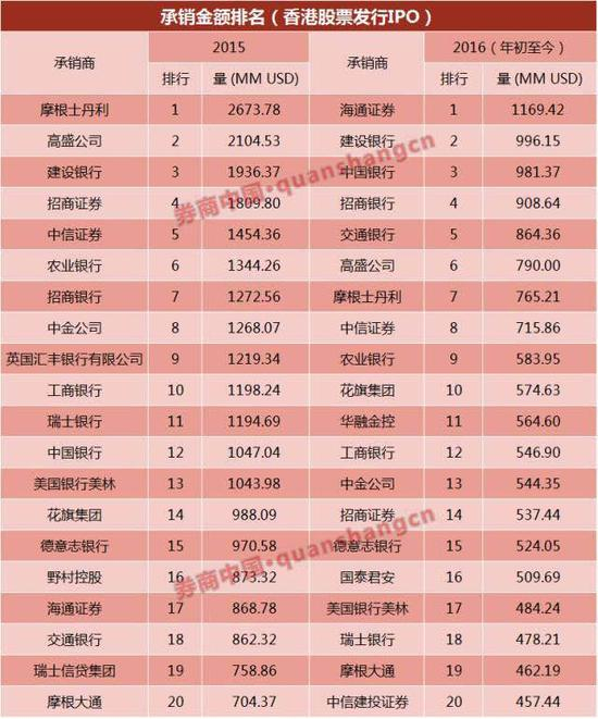 彭博数据表明,2015年香港市场的股票发行量(包括IPO和再融资),排在第一位的是摩根士丹利,排名前十的中资投行有中信、中金、建行、海通共4家。而今年年初至今,占据第一的虽仍为摩根士丹利,但除了海通、建行之外,中行、农行、交行排名也进入前十。