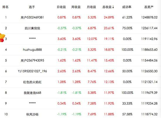 “用户5302469381”以总收益24.89%的成绩获得今日冠军,“四川黄倪倪”以23.61%的成绩获得第二名,“用户3477354371”以总收益19.11%的成绩获得第三名。
