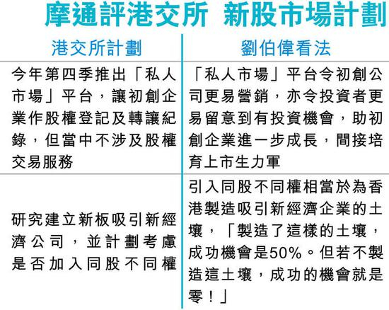 除私人市场外,港交所亦研究建立新板吸引新经济公司,并计划考虑是否加入极具争议性的同股不同权。刘伯伟称,当初亦不大同意在港行同股不同权,惟市况有变,客户需求愈来愈多,加上香港已多年未见产品创新,应与时并进。