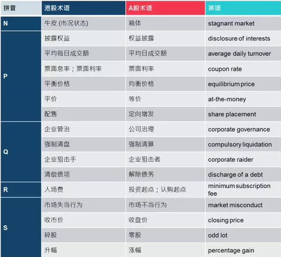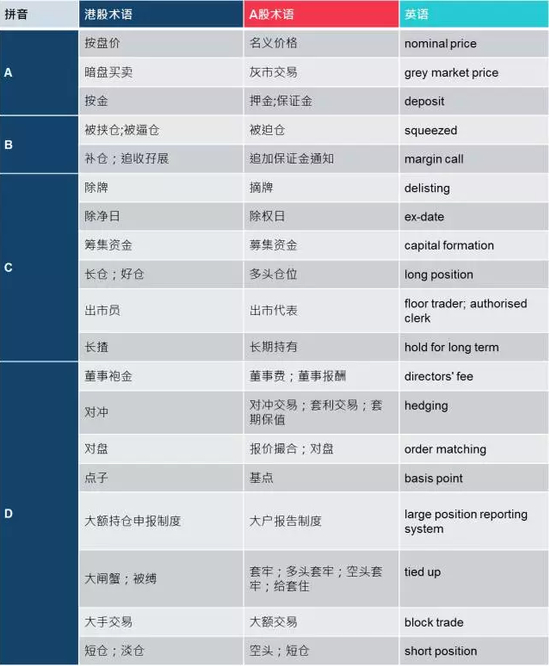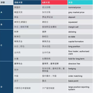 为方便内地投资者掌握香港的市场信息,以下为一些常用港股和A股的市场术语,以及相应的英文。词汇以汉语拼音排序以便查阅,赶快收藏吧!
