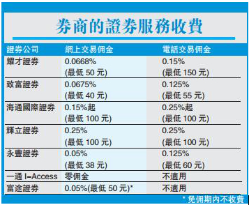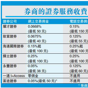证券买卖杂费繁多,小数怕长计。综观各间证券行及银行的证券户口,证券行提供的证券户口,部分收费始终较低。