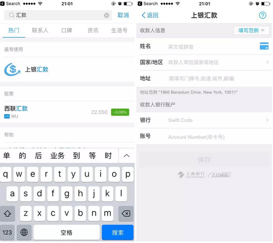 和换汇一样,跨境转账在网上银行、手机银行就可以办理了。另外还有支付宝的跨境转账,操作简单而且手续费低。在支付宝搜索框直接搜索“汇款”,选择上银汇款就可以: