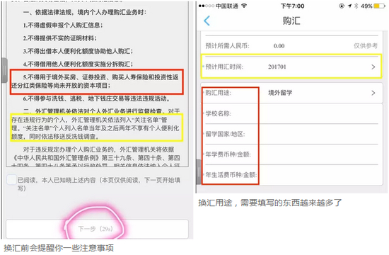选择好换汇用途后,要填写的东西变多了。比如以前只需要选择“出国留学”,而现在选择“出国留学”,必须填写是去哪个学校、哪个国家、花费多少等;选择出国旅游,要填写出去几天,去什么国家等;同时还要写“预计用汇时间”。