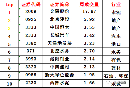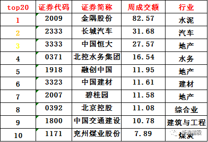 雄安概念股周成交额前三名分别是金隅股份、长城汽车、中国恒大。其中,金隅股份交易额高达82.57亿。在行业分布中,top榜主要集中于水泥、地产、水务等行业。
