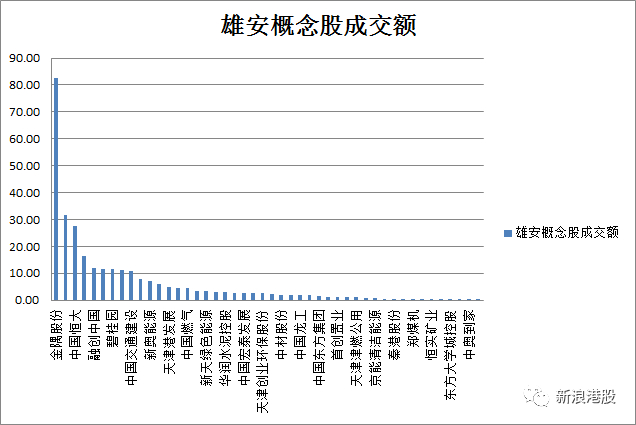 雄安概念股成交额大部分低于10亿,其中,金隅股份以成交额82.58亿港元居于第一名,第二、第三名长城汽车和中国恒大成交额分别为31.68亿港元和27.57亿港元。中奥到家成交额为3171500元,处于雄安概念股的成交额最后一名。