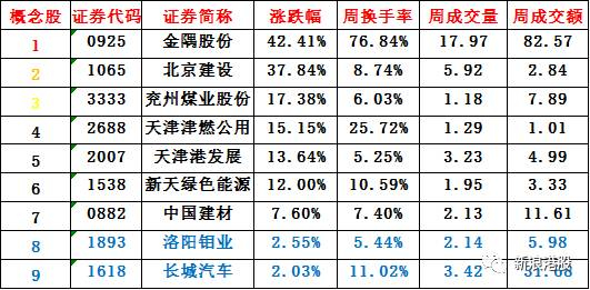 通过四张图梳理,小编以涨幅大于0,周换手率大于5%,周成交量大于1亿股,周成交额大于1亿港元进行筛选共计9只概念股。更严格来筛选:涨幅大于5%,周换手率大于5%,周成交量大于1亿股,周成交额大于1亿港元进行筛选共计7只概念股。金隅股份以绝对优势处于雄安概念股龙虎榜第一名,其次是北京建设,兖州煤业、天津津燃公用、天津港发展、新天绿色能源、中国建材、洛阳钼业、长城汽车。具体情况如下: