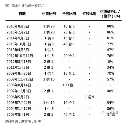 高山企业(前称永义实业,股票编号:616),由2003年至2016年,一共进行了14次供股,其中10次是大比例供股(最大比例是2015年两次的1供20),9次合股(最大比例是2008年一次的100合1),及1次送红股。