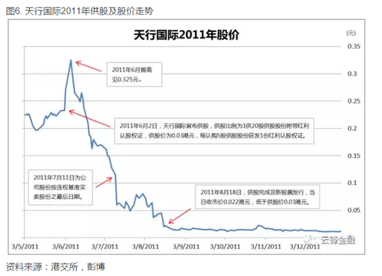 2011年6月2日,天行国际(现已改名为华融金控,0993.HK)宣布大比例大折让供股计划,供股比例1供20,供股价每股0.03港元,每供5股送1份红利认股权证,集资不少于7亿7千多万港元。宣布供股前,天行国际每股0.233港元,供股价大幅折让超过八成,6月7日曾最高升至每股0.325港元。但供股完成当日(8月18日),股价已经跌到了0.022港元,比供股价0.03港元又下跌了30%。