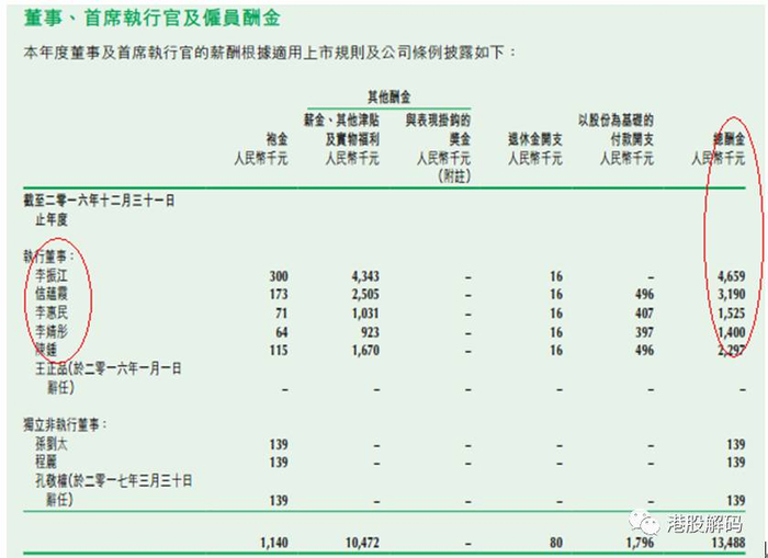 而李氏家族并非纯粹的只是拥有神威药业的股份,参与经营的管理层基本上是其家族的人。比如在五个执行董事中,就有三个姓李的,其中李振江为总裁,而李婧彤为李振江的女儿,执行董事兼总裁助理。在掌管财务方面,财务总监为李品正。2016年董事会成员的酬金达1348.8万元,李振江父女酬金共605.9万元,占比45%。