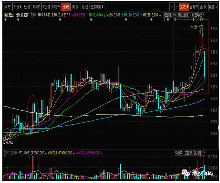 实际上,神威药业股价在2017年4月21开始连续8个交易日上涨,而它在中间时段4月26号发布年度报告。惨淡的业绩下仍不改上涨趋势,至2017年5月4号涨幅达10.2%至9.7港元,成交量放大,当日成交270万股,前一次成交量放大是在2016年12月13号,当时成交277万股。值得一提的是神威药业的市值仅为70多亿港元。