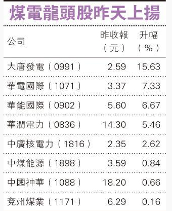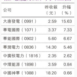 知情人士称,煤电行业改革的重组选项包括将大唐发电(0991)与中国神华(1088)及中广核(1816)与合并成一家公司;将华电(1071)、国电与中核合并为一家公司;以及将华能(0902)与国电投合并为一家公司。消息刺激一众相关股份股价上扬,大唐全日飙升15.63%,华电与华能亦各自升7.33%与6.67%,中广核与神华涨幅较小,分别升2.62%与0.66%。