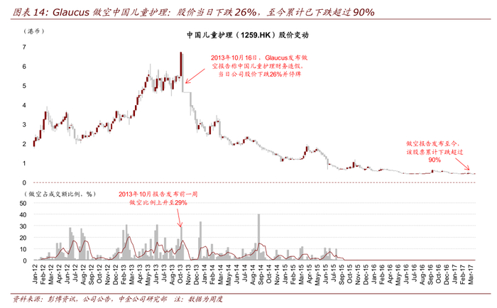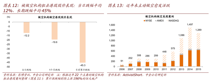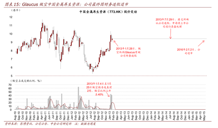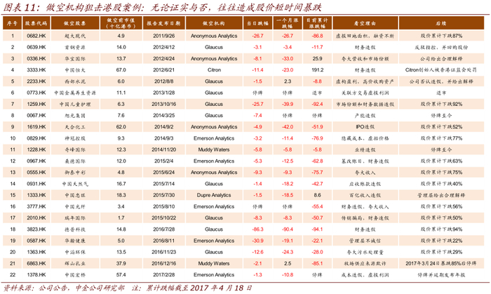做空机构主动做空往往造成公司股价大幅波动。在海外市场存在着一类对公司主动做空的研究机构,包括 Muddy Waters,Glaucus 和 Emerson Analytics 等,发布对于公司股价看空的研究报告,理由经常是对公司财务真实性的质疑。近年来美国上市的中概股频频遭遇机构做空,港股也成为狙击对象。通过研究近年来被做空机构狙击的 22 个主要港股案例我们发现,无论最终质疑被证实与否,做空报告平均造成股价当日暴跌 10%,如果财务造假无法澄清长期跌幅可能超过 50%,甚至长期停牌和退市。