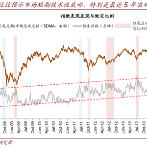 15%左右的卖空比例(5 日移动平均值 ) 对市场阶段性底部的指示性较强。经验上,由于卖空比例有长期抬升的趋势,“极端高”的定义随时间变化,当前“极端高的卖空比例”约为 15%左右(5 日移动平均值)。如图表 10 所示,最近 10 年内的 15 次极端高的卖空比例中有 10 次对应市场短期底部(红色区域),准确率 75%;最近 5 年的准确率更高,6 次卖空比例极端值全部对应市场阶段性底部。