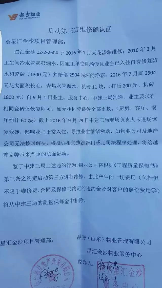 李先生出示了一份越秀地产《启动第三方维修确认函》,上面写明:“2016年1月天花板渗漏维修;2016年3月卫生间冷水管起鼓漏水……2016年7月底天花板大面积长毛,查热水管漏水,扒砖11块……截至2016年9月29日中建三局现场负责人未进场恢复瓷砖,影响业主正常入住,导致业主情绪激动,如物业公司及地产公司无法按时解决,将投诉相关执法部门或走司法程序处理,将给越秀品牌带来严重的负面影响。鉴于中建三局上述违约行为,物业公司将根据《工程质量保修书》第三条之约定启动第三方进行维修,由此产生的一切费用(包括但不限于维修费、合同及保修书约定的违约金及对客户的赔偿费用等)将从中建三局的质量保修金中扣除。”