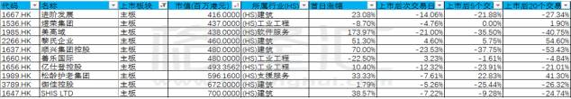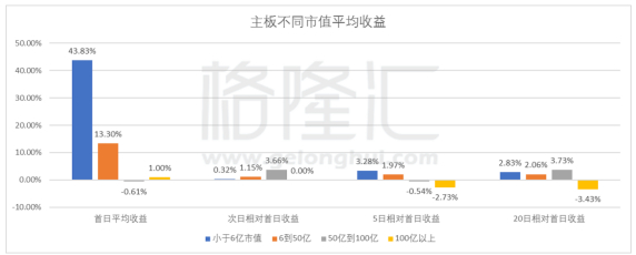 市值最大10只股票首日涨幅,上市后次日交易日涨跌幅(相对于首日收盘),上市后5个交易日涨跌幅(相对于首日收盘),上市后20个交易日涨跌幅涨幅分别为0.52%、3.06%,1.37%、-1.46%,中位数为-0.07%、0.33%、0.27%、-1.36%。