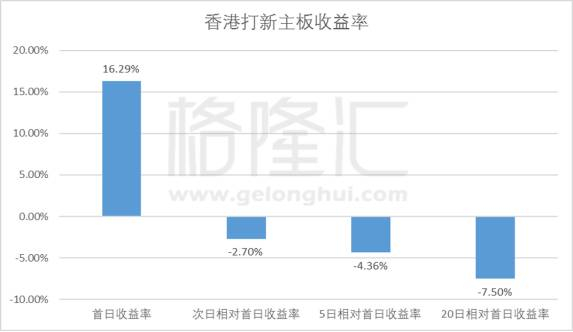1、主板的收益率明显比创业板低得多,毕竟少了许多踩雷风险,首日的平均收益为16.29%,虽然次日、5日、20日平均收益率为负,但跌幅会缓和地多,从中位数上看,只要不踩雷,短期内的首日的中位数与平均值差距不远,即是说收益的分布比较平稳,挣到钱的几率也会比离差值比较大的创业板要大一些。明显的,在收益稳定性上,港股主板更胜一筹。