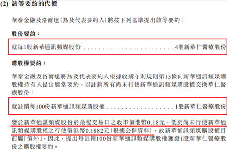 当时华仁医疗给出的条件是:结合新华通讯当日收市价0.18港元/股计算,以4股华仁医疗股份换1股新华通讯股份;而行权价格为0.1882港元的购股权,则按1股华仁医疗股份换取注销100份新华通讯购股权。