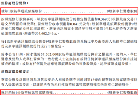 之后,在3月16日当天,新华通讯和华仁医疗同时发布了修订要约收购条件的公告。原本4股换1股和1股换100份购股权的条件,改成了9股换1股,以及4股换1份购股权。
