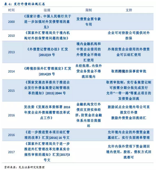 可以看到,自2014年来,国家在监管上越来越宽松,不仅是资金回流和结汇上有更大的自由度和选择权,审查上也给了发债券企业更大的自主性和便利性。一方面由于811汇改以来外资流出给资本账户造成的压力,外汇监管政策由2014年29号文出台时的“控流入、扩流出”向当前“控流出、扩流入”发生整体态度的转变;另一方面,企业在境外发债,能进一步发挥国际资本市场低成本资金在促投资、稳增长方面的积极作用,给相关企业带来更好的效益,还有利于国内企业国际形象的提升。