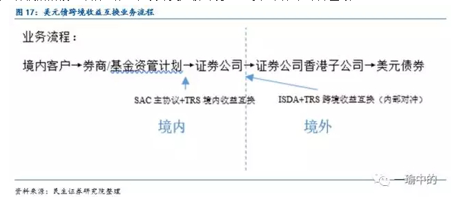 靠国内券商香港子公司进行美元债资产配置,在期末交割时,券商大陆母公司和香港子公司进行内部结算。在交易流程上,境内机构与券商签订收益互换协议,支付保证金,互换标的为境外证券,包括美元债。该产品能够提供0-2倍融资杠杆倍数。美元债的跨境收益互换尚属内资券商的业务摸索阶段,个别证券正在设计美元债跨境TRS,资金门槛在千万量级。