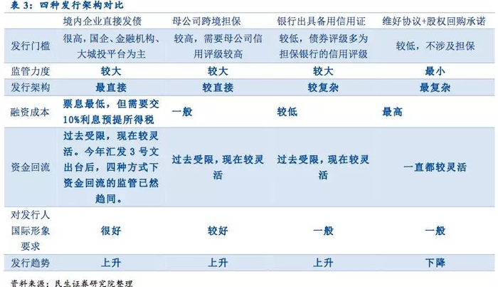 中资美元债的发行架构主要有四种,分别是境内/外银行提供备用信用证担保、境内集团公司跨境担保、维好协议+股权回购承诺和境内公司直接海外发债。