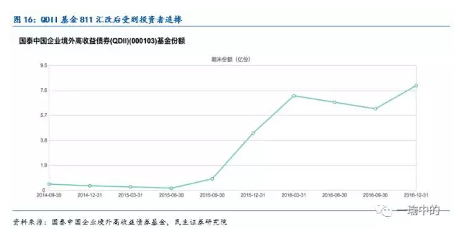 2015年811汇改后人民币兑美元持续贬值,资本外流现象越发严重,QDII颇为紧俏。例如国泰中国企业境外高收益债券基金份额在811汇改后近似扩大为原来的10倍,可见其销售火爆。为了抑制资本过度外流,目前部分QDII的购买已经暂停,多数QDII不接受大额订单交易。