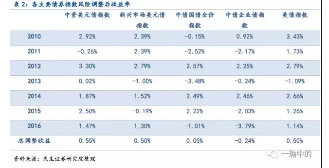整体风险调整后收益分析。中资美元债的风险调整后收益率为0.55%,而新兴市场国家美元债指数与美债指数的风险调整后收益率均为0.5%,显然中资美元债单位风险下的收益更高。