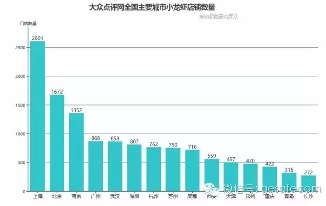 截止2016年8月,大众点评网上关于小龙虾的总餐馆数高达1.7万家,热门城市分别如下: