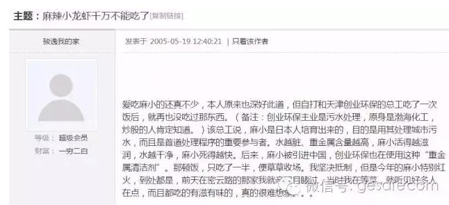 再找,2005年5月19日,发表在搜房某业主论坛里的一个主题为《麻辣小龙虾千万不能吃了》的一小段留言,是目前我们能搜到的关于小龙虾谣言的最早出处。