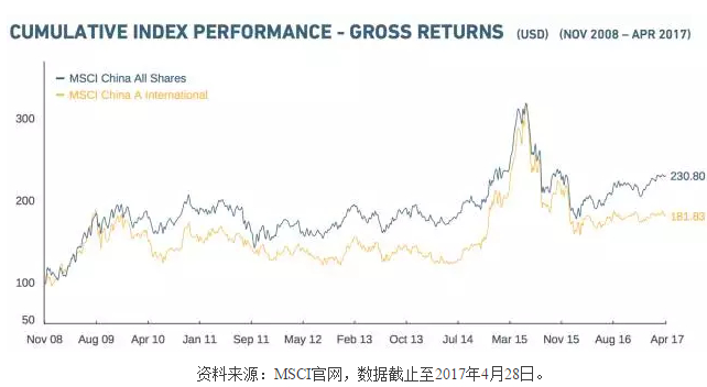 目前MSCI中国全股票指数和MSCI 中国A股(国际)指数的表现对比如下: