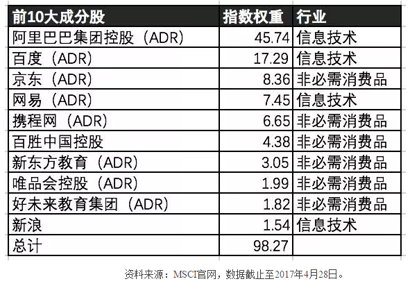 看看前十大权重股便可知原因,几乎都是风生水起的国内巨头。当然,由于阿里巴巴个头太大,在上市后占据了几乎一半的权重。