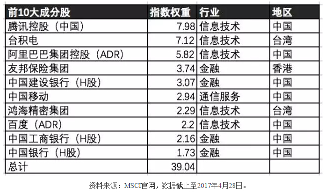 截止4月底这个指数拥有195支成分股,其中十大权重股中有两支香港本地股,分别是友邦保险(AIA GROUP)和长江和记实业(CK HUTCHISON)。