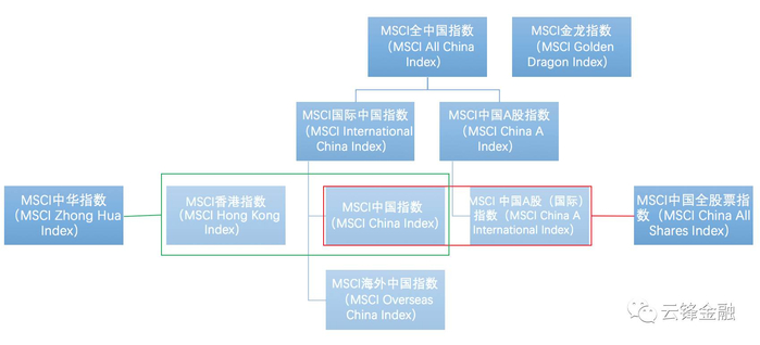 最后用一张图全面解析MSCI中国指数体系的族谱,希望下次再有媒体乱用指数名称的时候,你能微笑中透出自信的指出它们的错误。