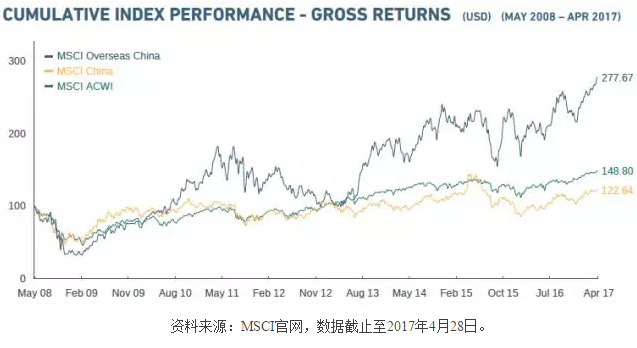 在MSCI中国指数纳入中概股之前,投资者想要跟踪在海外上市的中国公司,最主要的基准就是MSCI海外中国指数。