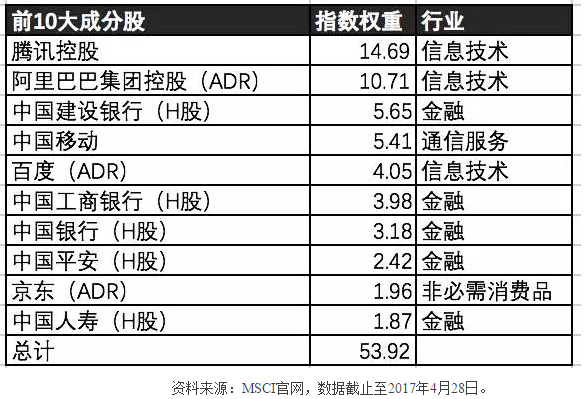 截止2017年4月底,MSCI中国指数拥有149支成分股,涵盖港股中的H股、红筹股和民企股,以及B股和海外上市的股票(如美股ADR)。指数总市值达 1.21万亿美元,覆盖了全球范围内中国股票市值的85%。当然,是除A股之外的市值。