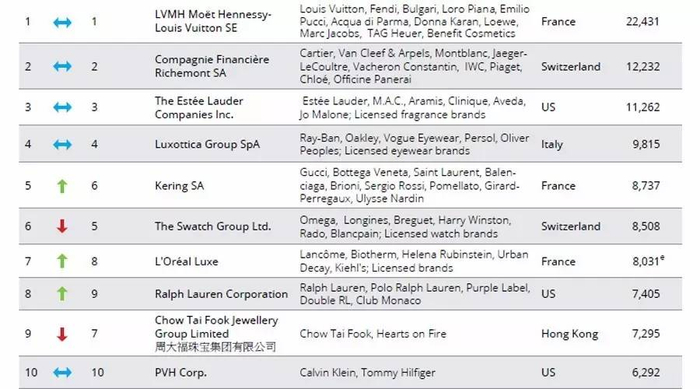 德勤(Deloitte Touche Tohmatsu Limited)2017奢侈品全球力量报告(Global Powers of Luxury Goods report)公布了本年度的全球100大奢侈品公司排行榜。前三位依旧是法国路威酩轩集团(LVMH)、瑞士历峰集团和美国雅诗兰黛集团。进入前十名的公司没有变化,但是排序发生了变化。