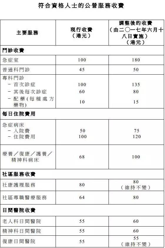香港食物及卫生局同时表示,专科门诊首次诊症费由100元增至135元,其后每次诊症费由60元增至80元。急症病床住院费用由每日100元增至120元,而社康护理服务收费则维持80元,以鼓励康复医院的病人早日出院。