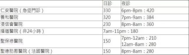 大部分私家医院门诊是24小时服务,一般分为日诊及夜诊不同收费,仁安医院及圣保禄医院则分3时段收费;周末及红日假期收费亦不同。