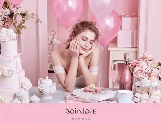 品牌宣传海报上无处不在的马卡龙、扑面而来的马卡龙粉色以及被香槟玫瑰蛋糕围绕的广告女主角,在努力营造一种年轻浪漫的时尚感的同时,还不忘提醒你这个品牌的野心——钻戒中的公主。请来的品牌代言人也都是“皇室”——电视剧三生三世里的翼族公主和大皇子离怨。点开周大福的微博,你会看到它还买下了欢乐颂2的独家珠宝品牌合作。此外,周大福还为SOINLOVE拍了一条称得上“浪漫求婚指南”式的广告宣传片,来表达“爱情原本的滋味,就像蜜糖和甜品一般甜腻而诱人”的主题。