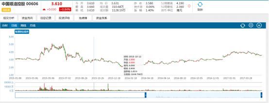 并且从中国粮油控股的近几年的数据可以看到,公司由于一直是涉及上游的农产品部分,随着农产品价格的周期性变动,其利润水平每年的浮动也非常之大,比如2013年还能实现15.7亿净利润的中国粮油控股,到了2014、2015年均出现大幅度的亏损。