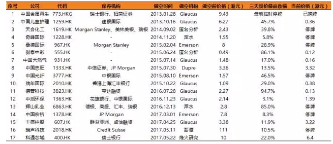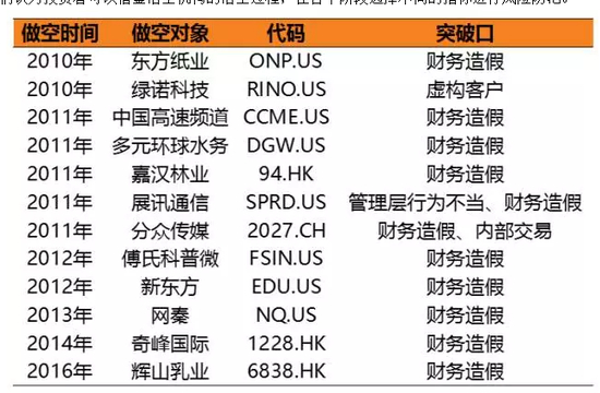 以及近期浑水沽空辉山乳业(6863.HK),称辉山乳业至少从2014年开始发布虚假财务报表、夸大其资产价值及负债颇多;Emerson沽空中国宏桥(1378.HK),指公司在2011年于香港上市后虚报生产成本,并从关联方以极低的价格买入电力与铝原料,共隐瞒了216亿元的成本,实际盈利能力不到其所声称的一半。