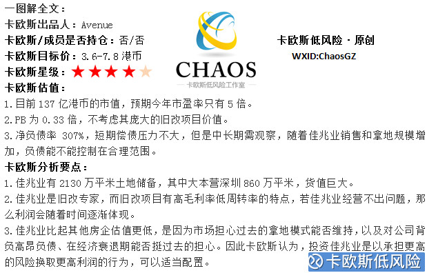 若佳兆业也以货值计算,将是大大地被低估:佳兆业拥有深圳占地面积860万平米的旧改项目,总的旧改占地面积1300万平米,这部分高价地货值可能上万亿。深圳龙岗盐田平湖等项目2017年-2018年上半年入市销售,可售建筑面积95万平米,货值数百亿。如果以货值对佳兆业估值,应考虑2个因素:佳兆业所持土地中很大一部分是旧改项目,旧改项目周转低于普通项目(周转时间约为普通项目5倍),净利率高于普通项目(约为2倍),因此,折算之后,佳兆业的估值可以向货值为5000-6000亿的房企看齐,综合对比之后估值为200-400亿港币。目标价3.9-7.8元。